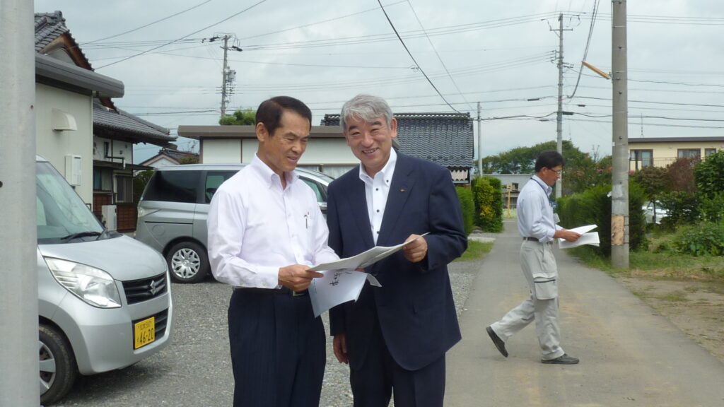 2017年9月には太田知事が上伊那に調査に来られましたので、国道153号伊駒アルプスロードの予定ルートについて現地調査をしていただきました。当時は事業着手前でしたが、私の地元が予定ルートに当たっており、このルートが地域を分断することから、ルートを変更してもらうよう要望しました(写真は私の事務所の前で太田副知事と)。