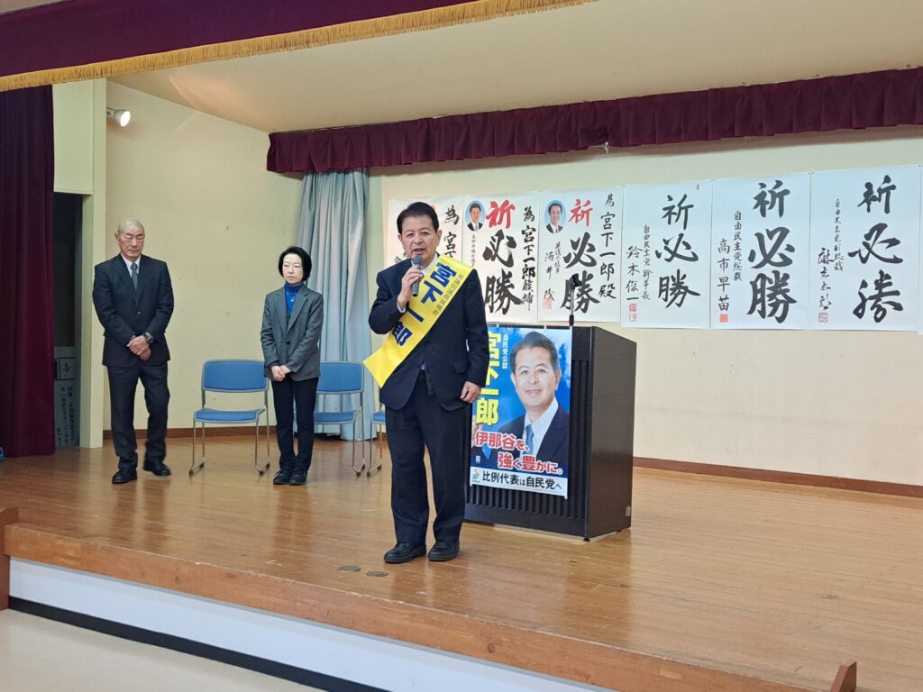 1月27日(火)に衆議院総選挙が公示され、長野5区の自民党公認候補の宮下一郎氏の出陣式が開催され、地元県議として出席しました。